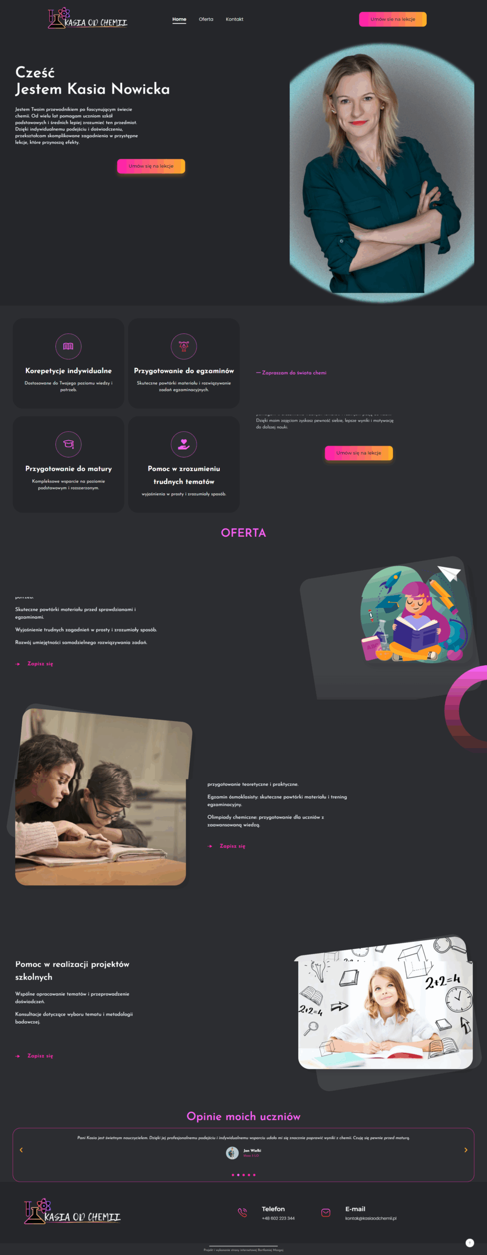 Strona Kasi Nowickiej korepetytorki od chemii. Strona przedstawiająca ofertę oraz ułatwiająca kontakt.
